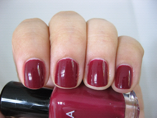 So here it is: Zoya Vanessa. Vanessa is described bt Zoya as: "Soft but saturated dark pink berry creme with red undertones. A delicious berry shade that looks very polished." And this description is perfect for Vanessa! In these photos (indoor artificial lighting) the polish looks more maroon than dark berry red, because it definitely looks more red in sunlight.